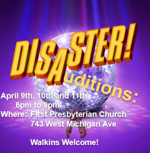 2nd round of auditions April 16th and 17th from 6:00pm-9:00pm (drop in)Get ready to boogie, belt, and bring the laughs—auditions are officially open for Disaster!, our upcoming 70s comedy musical!
